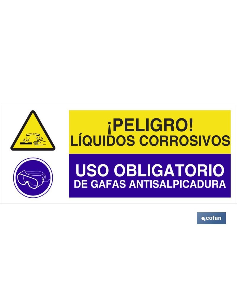 Señalización combinada de Peligro y Obligación. Medidas 507x210 mm y 717x297 mm Material Poliestireno. Pictograma y texto. PELIGRO LIQUIDOS CORROSIVOS - USO OBLIGATORIO DE GAFAS ANTISALPICADURA
