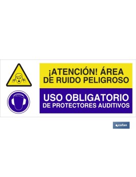 Señalización combinada de Peligro y Obligación. Medidas 507x210 mm y 717x297 mm Material Poliestireno. Pictograma y texto.ATENCIÓN AREA DE RUIDO PELIGROSO - USO OBLIGATORIO DE PROTECTORES AUDITIVOS