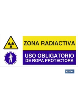 Señalización combinada de Peligro y Obligación. Medidas 507x210 mm y 717x297 mm Material Poliestireno. Pictograma y texto.ZONA RADIACTIVA - USO OBLIGATORIO DE ROPA PROTECTORA