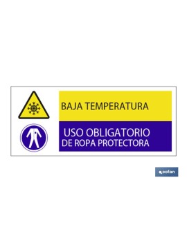 Señalización combinada de Peligro y Obligación. Medidas 507x210 mm y 717x297 mm Material Poliestireno. Pictograma y texto.BAJA TEMPERATURA - USO OBLIGATORIO DE ROPA PROTECTORA