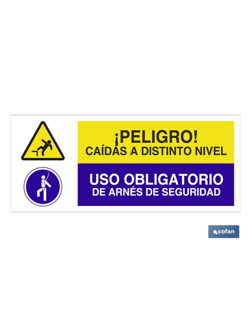 Señalización combinada de Peligro y Obligación. Medidas 507x210 mm y 717x297 mm Material Poliestireno. Pictograma y texto.PELIGRO CAIDAS A DISTINTO NIVEL - USO OBLIGATORIO DE ARNES DE SEGURIDAD