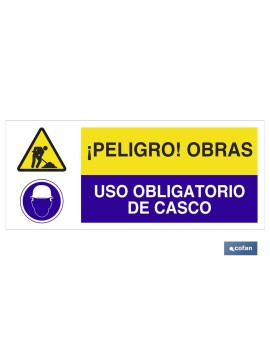 Señalización combinada de Peligro y Obligación. Medidas 507x210 mm y 717x297 mm Material Poliestireno. Pictograma y texto.PELIGRO CAIDAS A DISTINTO NIVEL - USO OBLIGATORIO DE ARNES DE SEGURIDAD