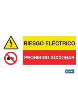 Señalización combinada de Peligro y prohibición. Medidas 507x210 mm y 717x297 mm Material Poliestireno. Pictograma y texto.ATENCIÓN PELIGRO RIESGO ELECTRICO - PROHIBIDO ACCIONAR