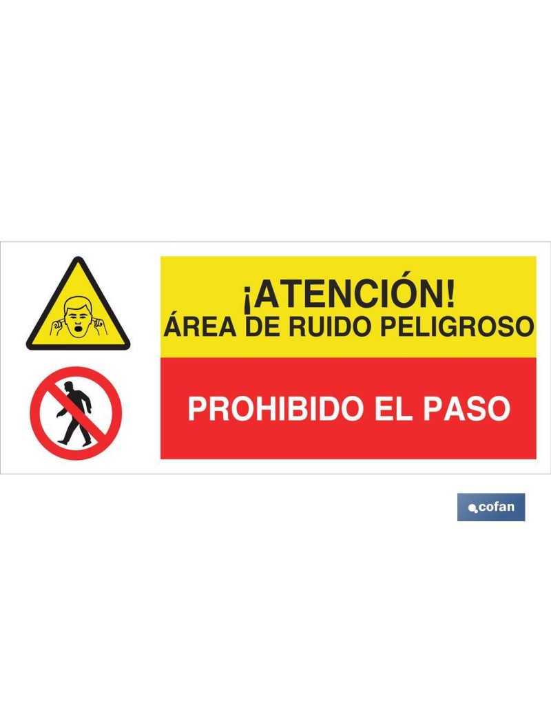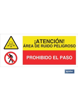 Señalización combinada de Peligro y prohibición. Medidas 507x210 mm y 717x297 mm Material Poliestireno. Pictograma y texto.ATENCIÓN RUIDO PELIGROSO - PROHIBIDO EL PASO