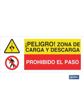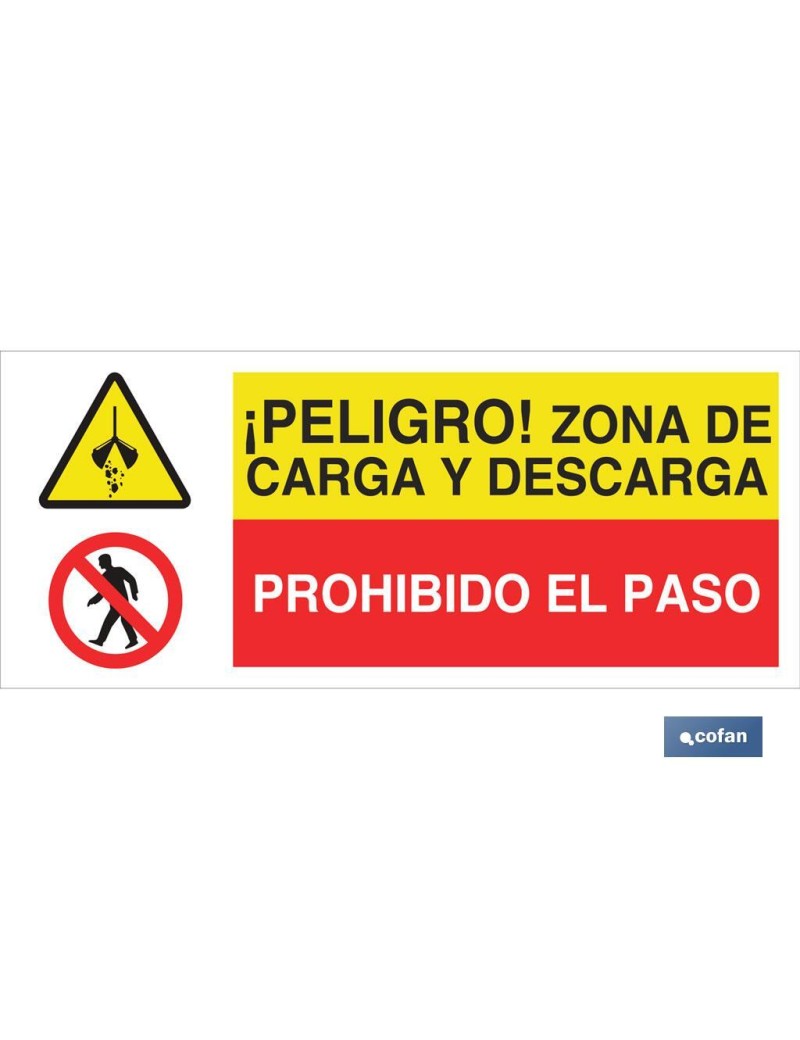 Señalización combinada de Peligro y prohibición. Medidas 507x210 mm y 717x297 mm Material Poliestireno. Pictograma y texto.ATENCIÓN ZONA DE CARGA Y DESCARGA - PROHIBIDO EL PASO