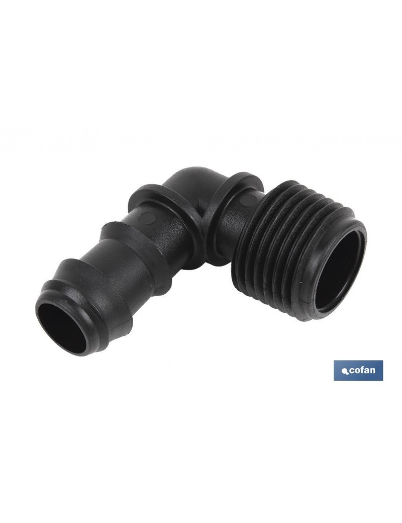 Conector en forma de Codo con rosca Macho especialmente indicado para riegos en Jardinería y Agricultura. Su diseño permite una fácil instalación. Fabricado en materiales de larga duración y resistencia para adaptarse a diferentes entornos. Rosca de 1/2 o 3/4.