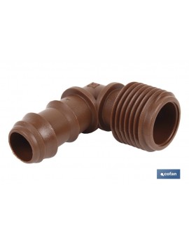 Conector en forma de Codo con rosca Macho especialmente indicado para riegos en Jardinería y Agricultura. Su diseño permite una fácil instalación. Fabricado en materiales de larga duración y resistencia para adaptarse a diferentes entornos.