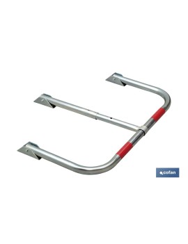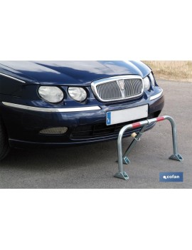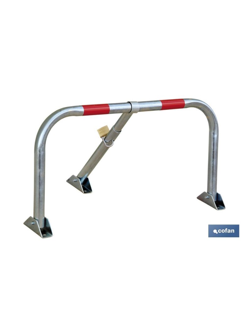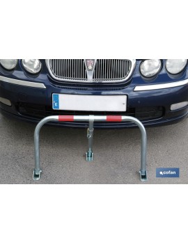 Conjunto bloqueo de parking con candado. Evita la ocupación de plaza de aparcamiento cuando el vehículo no se encuentra estacionado. Fabricado en acero galvanizado con bandas rojas luminiscentes para una perfecta visualización.