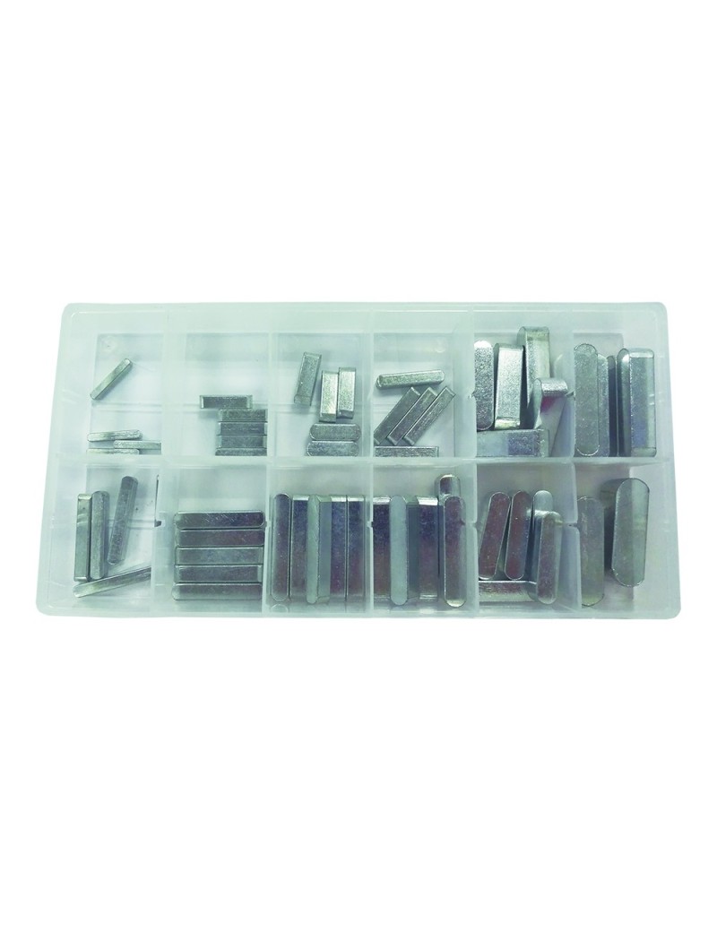 Estuche de 106 chavetas. Contiene: 3x3x25 (4pcs) 3x3x20 (4pcs) 5x5x30 (5pcs) 5x5x25 (5pcs) 5x5x20 (5pcs) 6x6x40 (5pcs) 6x6x30 (5pcs) 6x6x20 (5pcs) 8x8x40 (5pcs) 8x8x30 (5pcs) 10x10x40 (5pcs) 10x10x30 (5pcs) 12x12x40 (2pcs) Disponible en caja expositor de 6 unidades. Material: Acero al carbono
