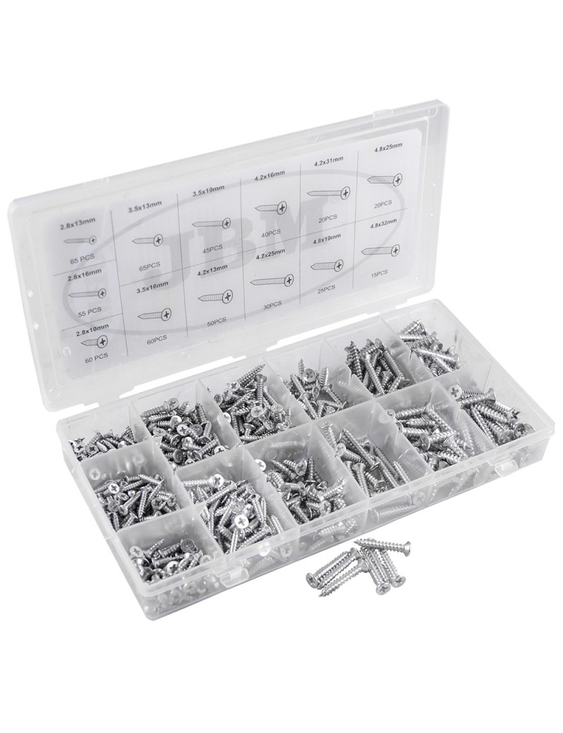 2.8x13mm - 65 unidades 2.8x16mm - 55 unidades 3.5x10mm - 60 unidades 3.5x13mm - 65 unidades 3.5x16mm - 60 unidades 3.5x19mm - 45 unidades 4.2x13mm - 50 unidades 4.2x16mm - 40 unidades 4.2x25mm - 30 unidades 4.2x31mm - 20 unidades 4.8x19mm - 25 unidades 4.8x25mm - 20 unidades 4.8x32mm - 15 unidades