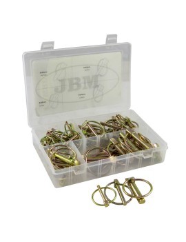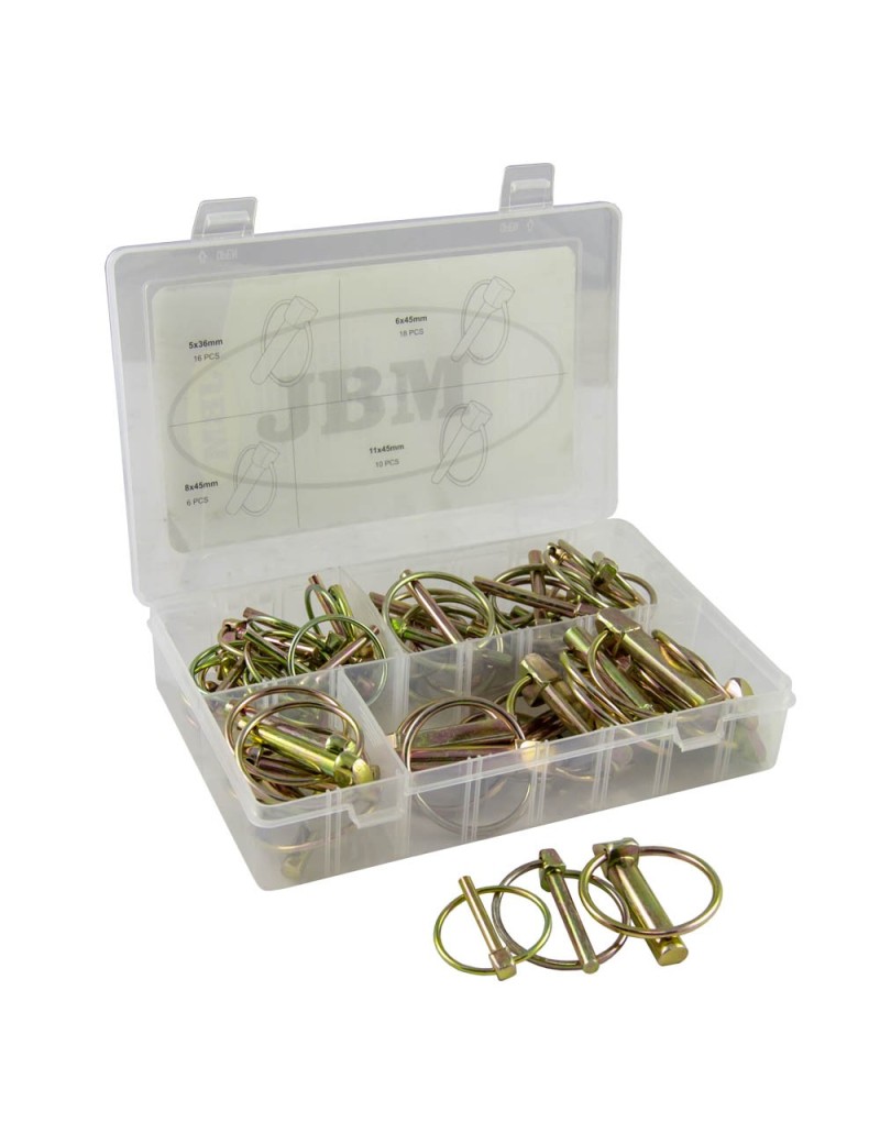 Estuche de 50 pasadores con anilla. Contiene: 5x36 (16pcs) 6x45 (18pcs) 8x45 (6pcs) 11x45 (10pcs) Disponible en expositor de 6 unidades.