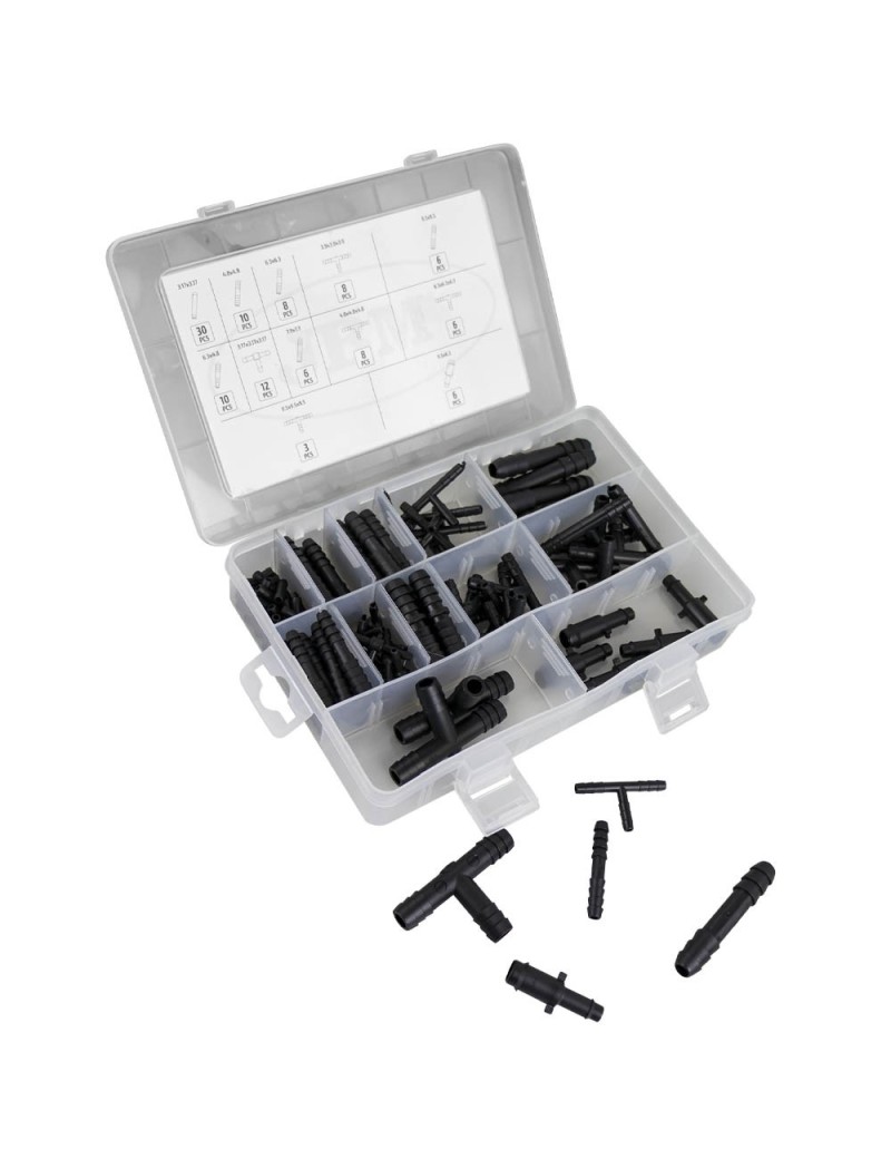 Material: PVC Peso: 0.23kg 1/8 "x 1/8" (3.17x3.17mm) Recto - 30pcs 3/16 "x 3/16" (4.8x4.8mm) Recto - 10pcs 1/4 "x 1/4" (6.3mmx6.3mm) Recto - 8pcs 5/32 "x5/32 "x5/32" (3.9x3.9x3.9mm) en T - 8pcs 3/8 "x 3/8" (9.5x9.5mm) Recto - 6pcs 1/4 "x 3/16" (6.3x4.8mm) Reductor - 10pcs 1/8 "x1/8 "x1/8" (3.17x3.17x3.17mm) en T - 12pcs 5/16" x 5/16" (7.9x7.9mm) Recto - 6pcs 3/16 "x3/16 "x3/16" (4.8x4.8x4.8mm) en T - 8pcs 1/4 "x1/4 "x1/4" (6.3x6.3x6.3mm) en T - 6pcs 3/8 "x 3/8 "x3/8" (9.5x9.5x9.5mm) en T - 3pcs 3/8 "x 1/4" (9.5x6.3mm) Reductor - 6pcs