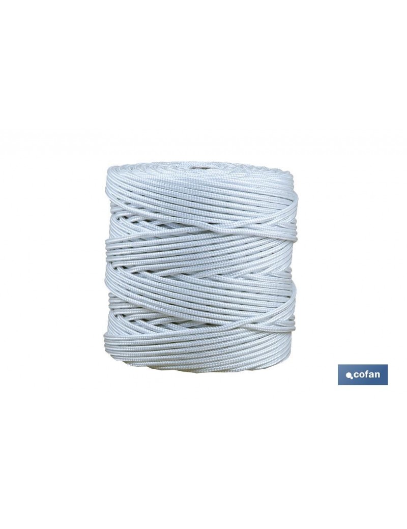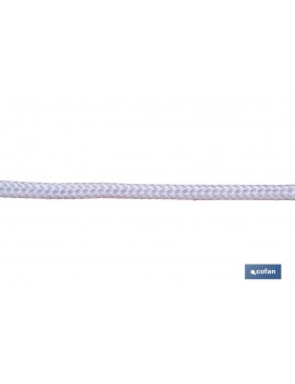 Cordón trenzado de color blanco de 5 mm de diámetro, adecuado para persianas. Cordón con polipropileno en el exterior y alma texturizada. Adecuado para persianas, toldos, redes, invernaderos, etc.