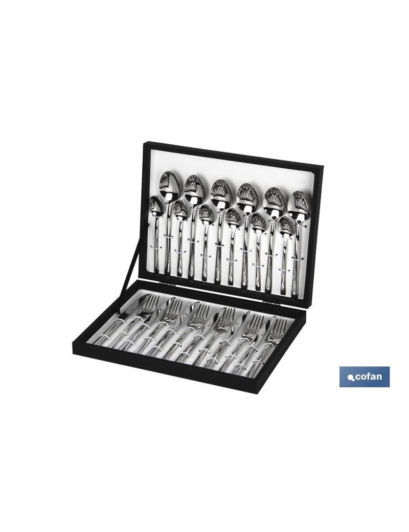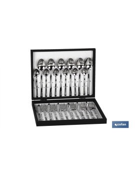 Cubertería de acero Inox. Modelo Bari Inox C-18/10. Con diseño cuidado, resistente y de gran calidad. Apta para lavavajillas. Está compuesta por 6 unidades de cuchillos de mesa, 6 tenedores de mesa, 6 cucharas de mesa, 6 cucharas de café. Presentación sofisticada y muy cuidada en un elegante estuche negro de madera. Llena tu mesa de elegancia y estilo con esta cubertería de Cofan Home con lineas sencillas, acertando para cualquier tipo de decoración y ocasión.