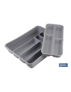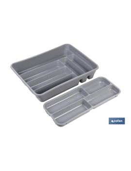 Cubertero de dos niveles en color gris claro:· Bandeja principal (40 x 30 x 7 cm.) con seis compartimentos.· Bandeja opcional (38,6 x 15,5 x 3 cm.) con cuatro compartimentos.Material: PolipropilenoIdeal para la organización de cubiertos y utensilios de cocina.