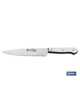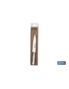 Cuchillo de Verduras de óptima calidad. Cuenta con una hoja de acero inoxidable, de 15 cm de longitud, y mango fabricado en en fibra de celulosa y melamina. Producto de alta resistencia y durabilidad. Envasado en blíster unitario. Fabricado en Albacete.