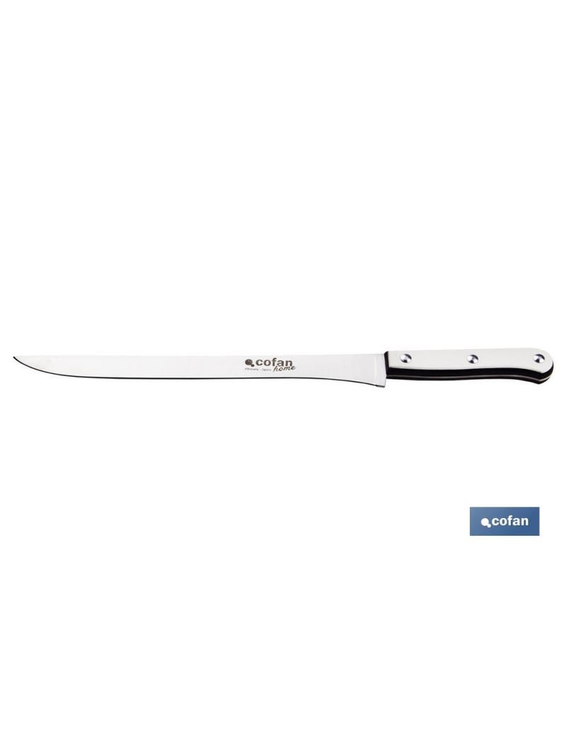 Cuchillo Jamonero de óptima calidad. Cuenta con una hoja de acero inox. microdentada de 25 cm de longitud y mango fabricado en fibra de celulosa y melamina, en color blanco. Forma una sola pieza con la hoja y se le denomina enterizo. Cuchillo Jamonero de alta resistencia y durabilidad. Envasado en blíster unitario. Fabricado en Albacete.