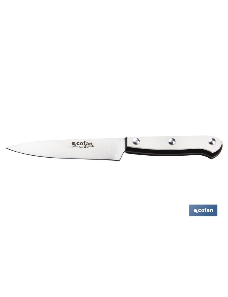 Cuchillo puntilla de óptima calidad. Cuenta con una hoja de acero inox. y mango fabricado en fibra de celulosa y melamina en color blanco. La longitud es de hoja 11 cm. Forma una sola pieza con la hoja y se le denomina enterizo. De alta resistencia y durabilidad. Envasado en blíster unitario. Fabricado en Albacete.