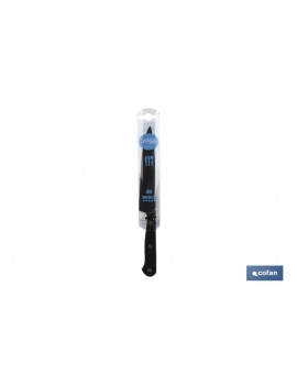 Cuchillo de Verduras Profesional de óptima calidad. Cuenta con una hoja de acero inoxidable cuya longitud de hoja es de 15 cm y mango fabricado en POM en color negro. Su acabado pulido mate. Producto de alta resistencia y durabilidad. Envasado en blíster unitario. Fabricado en Albacete.