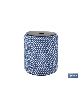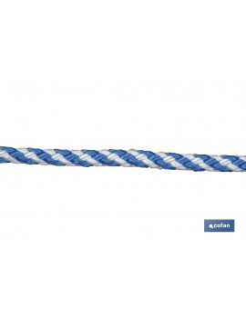 Cuerda trenzada helicoidal 100% polipropileno color azul/blanco, realizada con alma trenzada en 8 cabos y  24 cabos en granete. Cuerda trenzada en diámetros desde 6mm hasta 16 mm. Cuerda muy flexible y suave al tacto.