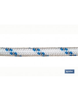 Cuerda trenzada de polipropileno color blanco/azul, realizada con alma trenzada en 8 cabos y el exterior en 24 cabos. Cuerda trenzada en diámetros desde 6mm hasta 20 mm. Resistente a los rayos solares, a la tracción, al roce y al agua. Indicada para bombas sumergibles, náutica, construcción, etc...