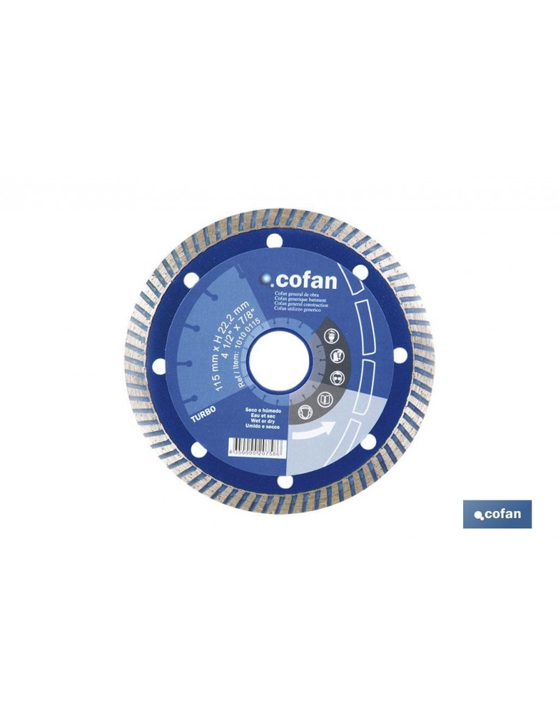 Discos de diamante turbo Cofan obra estándar universal base. corte de todo tipo de materiales de construcción. Excelente corte en seco o húmedo.