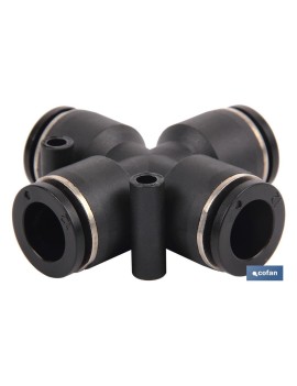 Empalmes o enchufes rápidos para tubería de aire en forma de cruz, con medidas desde 4 hasta 12mm de diámetro.