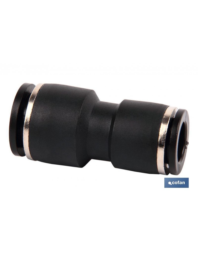 Racores enchufe rápido de reducción, totalmente en plastico, recuperables de conexión instantánea para tubos desde 4mm hasta 12mm de exterior. Adecuados para instalaciones de aire comprimido. Fácil visión del calibre de la tubería. Total seguridad y estanqueidad, incluso en condiciones límite.
