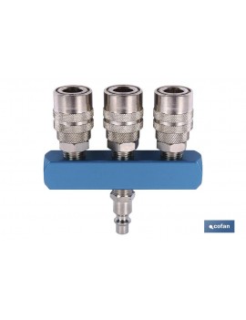 Enchufe rápido de 3 salidas. Recomendado en  instalaciones donde pueden enchufarse varias tuberías en la misma fuente de alimentación de aire.