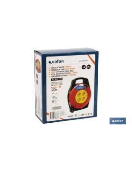 Enrollacables eléctrico con cuatro tomas o enchufes y 20 metros de longitud. Enrollacables provisto de conmutador de seguridad por sobrecarga, seguridad para niños. Tambor enrollador de cable de 20 metros de largo y sección de 3 x 1,5mm.