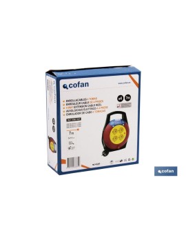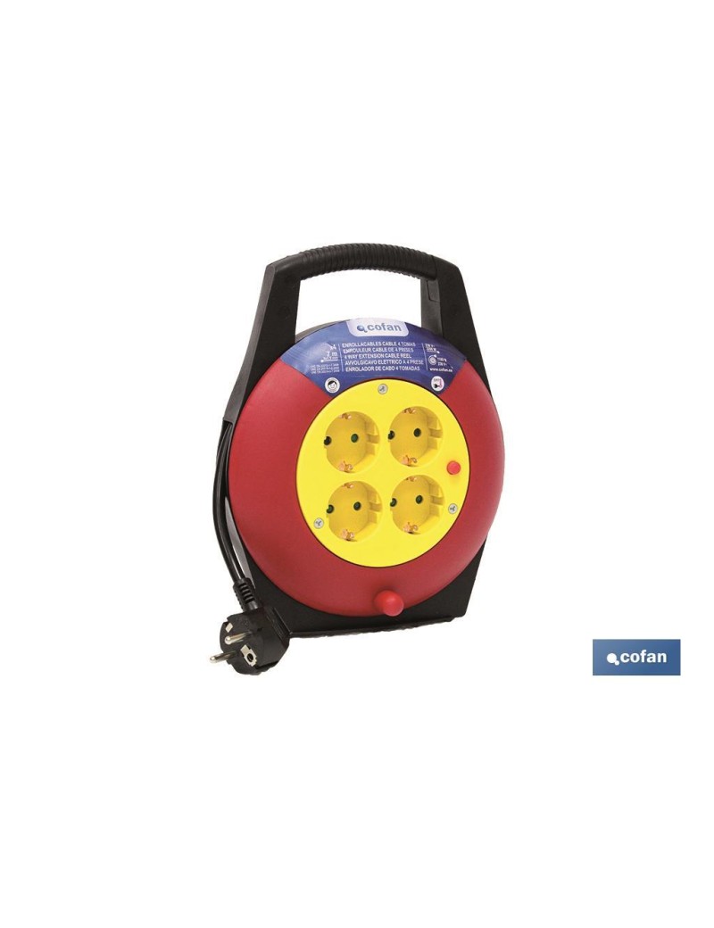 Enrollacables eléctrico con cuatro tomas o enchufes y 7 metros de longitud. Enrollacables provisto de conmutador de seguridad por sobrecarga, seguridad para niños. Tambor enrollador de cable de 7 metros de largo y sección de 3 x 1,5mm.