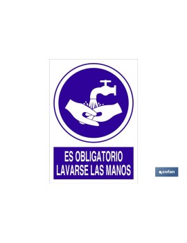 Señal de obligación con texto. Es obligatorio lavarse las manos.