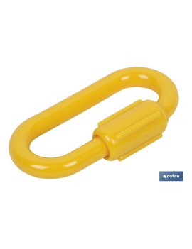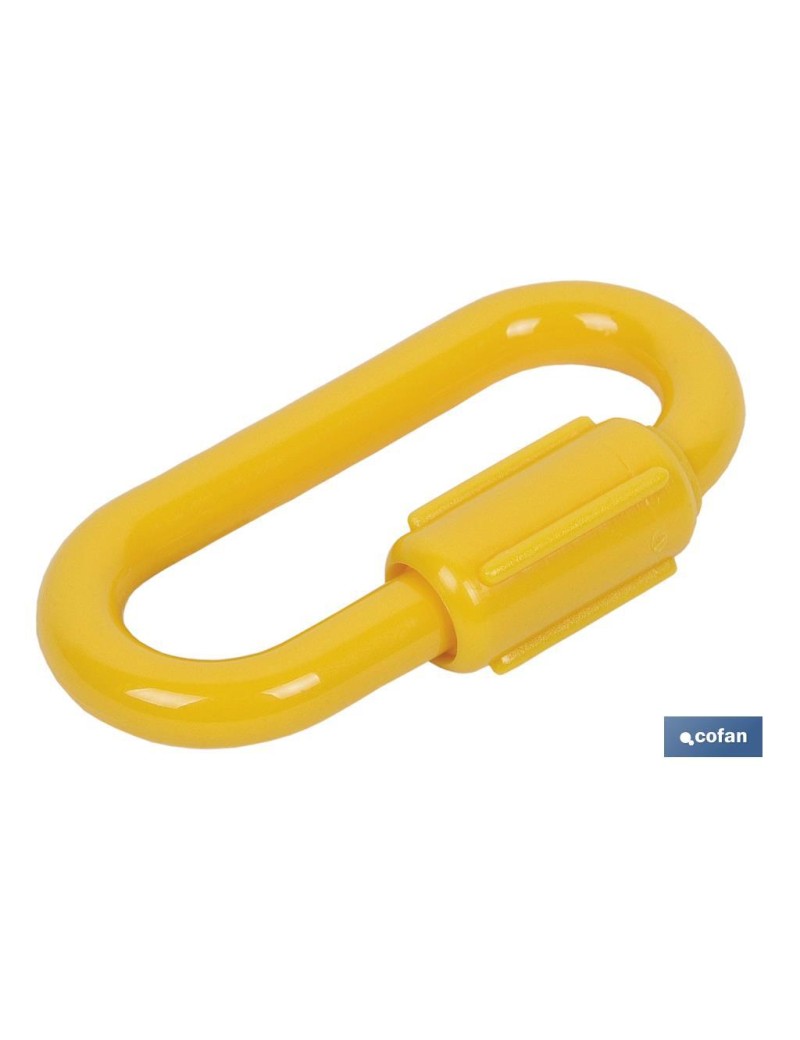 Eslabon de plástico amarillo, ideal para hacer uniones de cadenas de plástico. Cierre roscado en el lateral de la malla de unión amarilla.