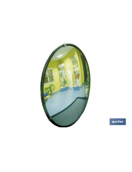 Espejo convexo de cristal acrílico adecuado para garajes, supermercados, cruces interiores, colegios, hospitales, etc. Reduce accidentes. Indicado para vigilancia. Incluye anclaje para pared. Diámetro 45 cm.