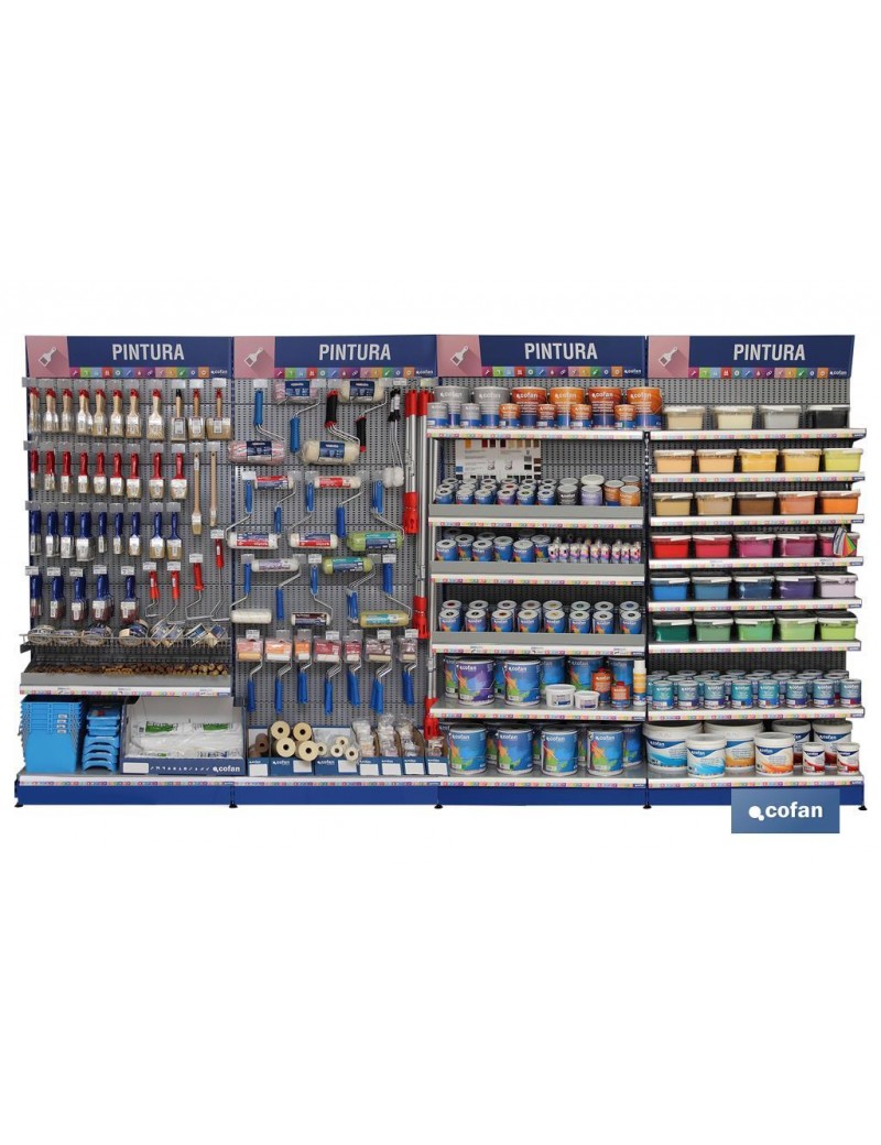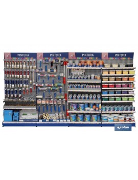 Expositores completos con accesorios y productos de Pintura: paletinas, brochas, pinceles, rodillos, pintura monocapa, esmalte de pintura, cinta crepe, papel KRAFT, etc. Incluye 4 expositores perforados (2200 x 1030 x 460 mm), 2 unidades de Conjunto de bandejas (1000 x 400 mm), 8 unidades de conjunto de bandeja con medidas de 1000 x 300 mm, 17 portaprecios bandeja con medidas de 1000 x 39 mm, 1 unidad de cesta 5 huecos (1000x 400 mm), 73 unidades de ganchos simple con etiquetero (200 x 6 mm), 4 unidades de bandejas angulares + 18 separadores de 1000 x 300 mm y 4 unidades de señalética imantada (975 x 200 mm).Además, dentro del equipamiento incluido entra: 5 unidades de gavetas 400 x 100 x 156 mm, 2 unidades de gavetas 400 x 200 x 156 cm y 7 unidades de gavetas 567 x 382 x 300 mm.