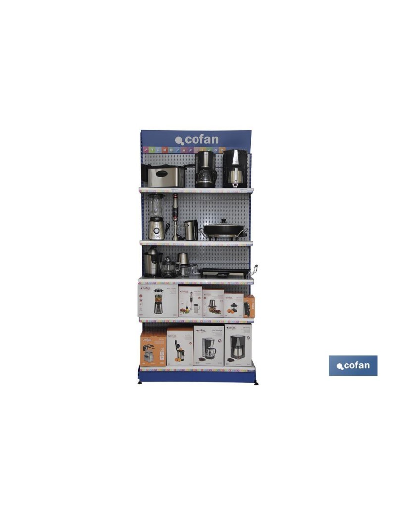 Expositor completo de Pequeño Electrodoméstico Cofan Home: batidoras, freidora, sartén eléctrica, plancha, exprimidores, cafeteras, picadora, etc. Incluye 1 expositor perforados (2200 x 1030 x 460 mm), 2 unidades de Conjunto de bandejas (1000 x 400 mm), 2 unidades de conjunto de bandeja con medidas de 1000 x 300 mm, 5 bandejas portaprecios con medidas de 1000 x 39 mm.