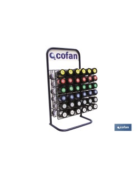 Expositor de sobremesa para 36 envases o botes de 400 ml. El expositor no incluye los botes de pintura, solo display (expositor). Medidas del expositor: 85 x 27,50 x 46 mm.