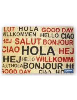 Felpudo interior con imagen pintada de Idiomas Hola de alta calidad. Ofrece una cálida bienvenida a tu hogar. Fabricado en fibra de coco floqueado y poliéster. Es antideslizante y con diseño pintado. Retiene la suciedad y absorbe la humedad. Sus medidas son de 40 x 60 x 1,50 cm. Tiene un diseño duradero y fácil de limpiar ofreciendo un rendimiento de durabilidad.