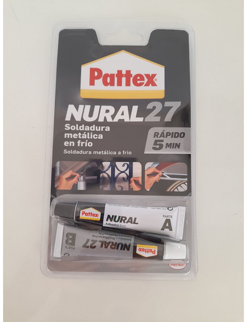 Pattex Nural 27 es una soldadura reparadora en frío, rápida (5 minutos), de gran resistencia, formulada en especial para pegar y reparar metales. Sus acabados son de color gris. Además, no contiene disolventes y no altera su volumen al endurecer.