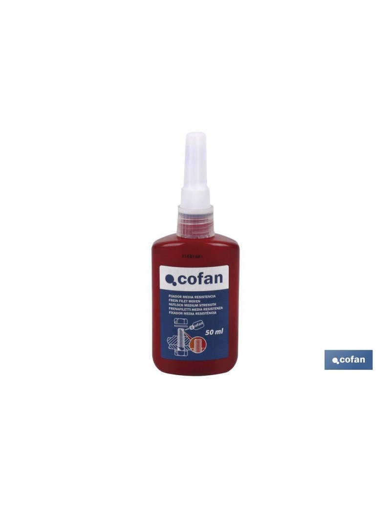 Fijador y sellador de roscas en media resistencia. Se utiliza para fijar y asegurar conexiones de tornillo para evitar su liberación bajo vibración, a la vez que posibilita el desmontaje de la rosca. Crea una película de plástico muy fuerte. El envase es de 50 ml y el producto de color azul oscuro. Indicado para bloquear tuercas, tornillos u otros elementos roscados. Tiene una alta resistencia al agua, aceite, combustible, líquido hidráulico y refrigerador, gases y vapores.