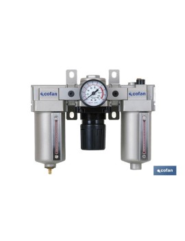 Regulador decantador y lubricador de instalaciones neumáticas de hasta 5000 litros de caudal de consumo. Varias posibilidades según consumo de caudal de aire comprimido.