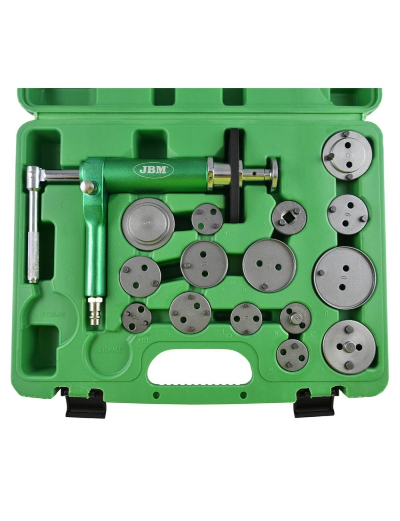 Pistola reposicionadora de frenos (x1) Adaptadores (x15): Adaptadores de 13/32" con dado de 3/8" // - GM Motors, Citroën // - GM Motors (x2) // - Citroën XM, Xantia // - Alfa Romeo, Audi, Austin, MBW, Ford, Honda, Jaguar, Mercedes-Benz, Mitsubishi, Nissan, Rover, Toyota, VW. // - Alfa Romeo 164 2,0, Ford, Mazda, Saab 9000, Subaru. // - Nissan Primera, VW - Golf IV // - Audi 80, 90, V8 + 100, Ford Sierra ABS + Scorpio ab 85, Honda Prelude, Nissan Silvia 1.8 turbo, Rover 8000, Saab 9000, Subaru L + Z, VW - Golf + passat // - Ford // - Saab, Honda // - Renault // - Cefiro, Maxima // - Opel // - Citroën