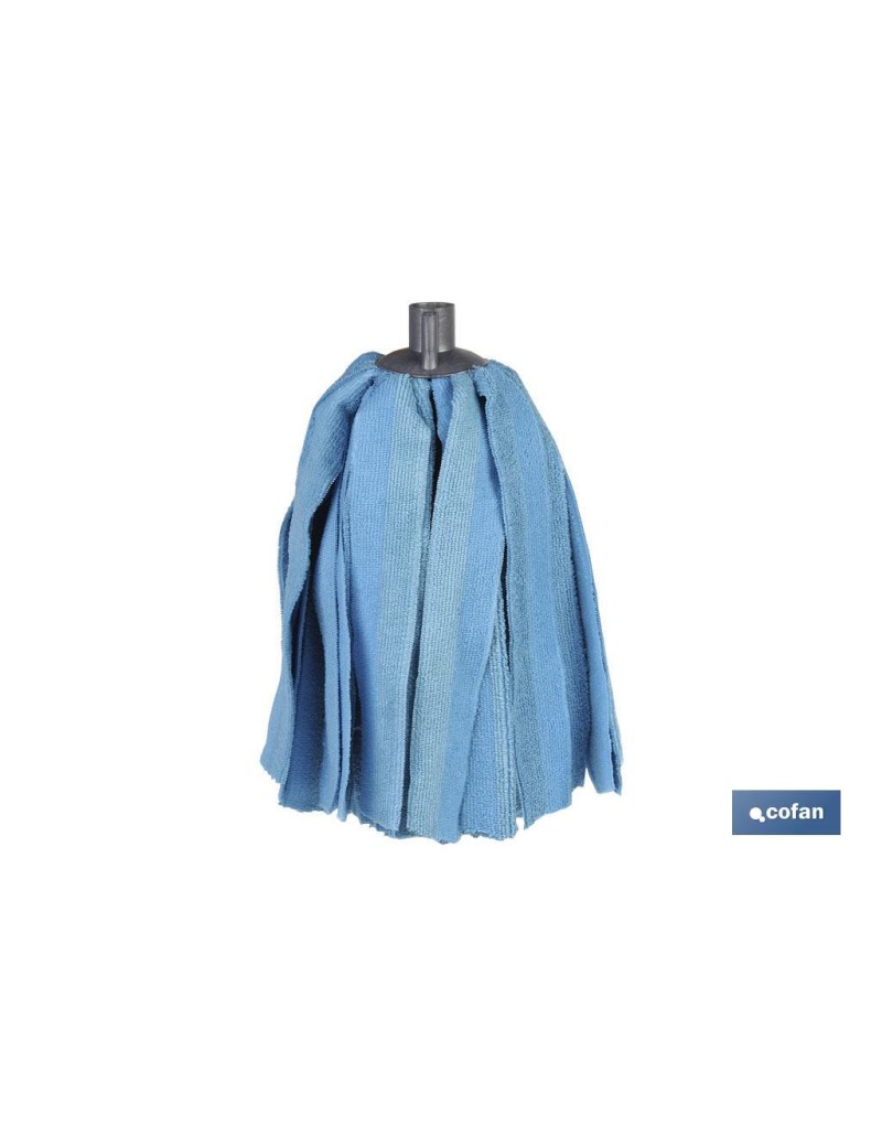 Fregona con tiras de microfibra disponible en color azul. Posee una gran capacidad de absorción y limpieza. Su grosor es de 155 gramos. Resistente a todos los detergentes del mercado, de mayor durabilidad y apta para todo tipo de palos estándar. Microfibra de alta calidad. Absorbe 10 veces su propio peso en agua.
