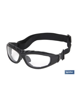 Gafas de seguridad oscura acolchada 4 en 1. Con correa intercambiable de foam. Resistente a la radiación UV. Sistema antivaho. Libre de metal. Con lente con recubrimiento duro.