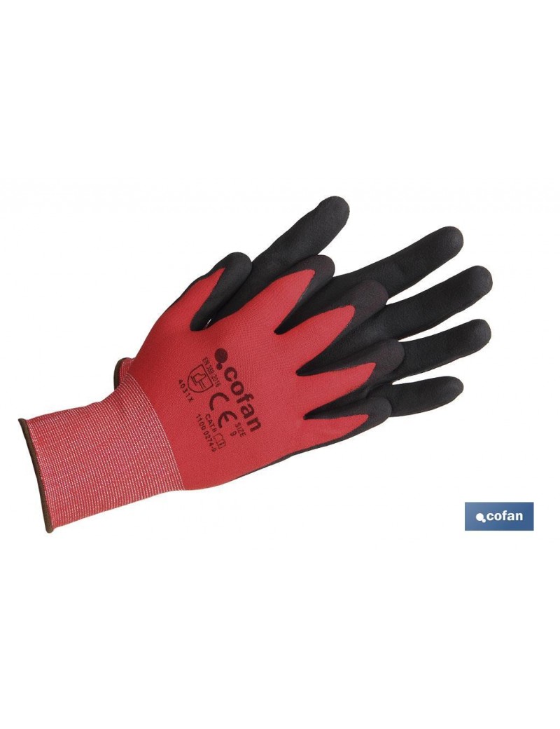 Guante impregnado sandy coating Rojo/Negro. Apto para automoción, construcción, manipulación de aceites o grasas... Disponible en 6 tallas.