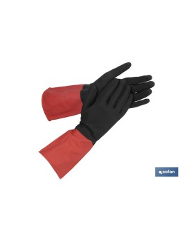 Guantes de 100% látex reforzado y flocado, fabricado en dos colores. Ideal para contacto con solventes, detergentes y productos químicos de baja peligrosidad. Construcción, limpieza, mecánica y mantenimiento.