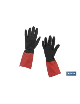 Guantes de 100% látex reforzado y flocado, fabricado en dos colores. Ideal para contacto con solventes, detergentes y productos químicos de baja peligrosidad. Construcción, limpieza, mecánica y mantenimiento.