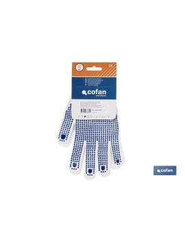 Guante de punto nylon, con puntos de PVC azul en palma y dedos. Gran adherencia para actividades agrícolas, recogida de frutas, etc. Disponible en 4 tallas con y sin blíster, además, tambien en formato unitario.