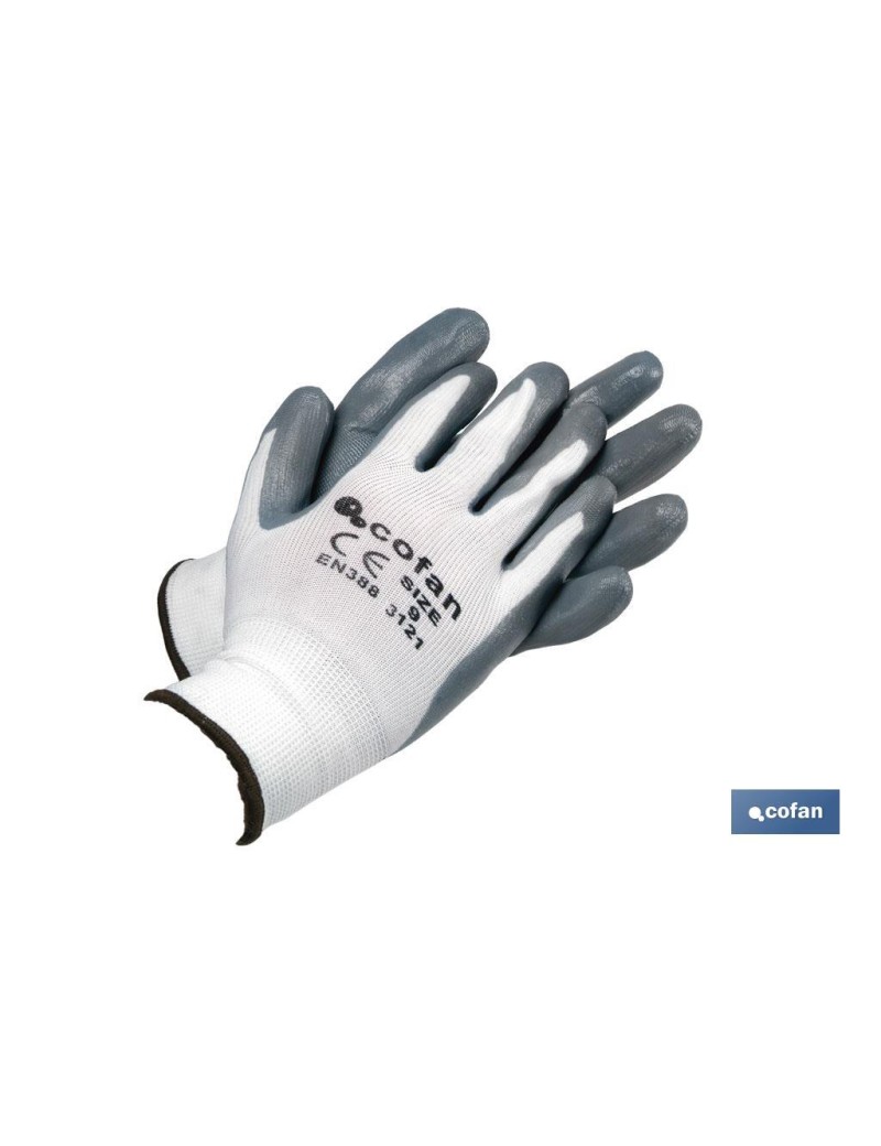 Guante gris/blanco 100% nylon impregnado, UNE-EN 20388, sin costuras. Impregnación de poliuretano en palma y dedos en color gris. Puño elástico, protección mayor de los dedos, robustez articular, gran durabilidad, mayor flexibilidad. Palma antideslizante.