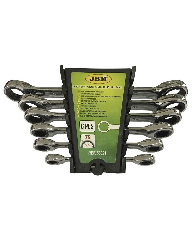 Incluyen 6 llaves con las siguientes medidas: 8x9,10x11,12x13,14x15,16x18,17x19mm. 72 dientes. Presentaci ³n en blister.